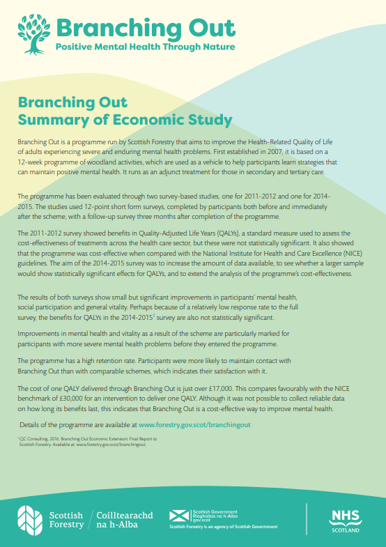 Branching Out is an innovative development for clients who use mental health services within Greater Glasgow and Clyde. This 2016 economic study report is a continuation of previous studies with the aim to obtain additional client data on the Branching Out programme.