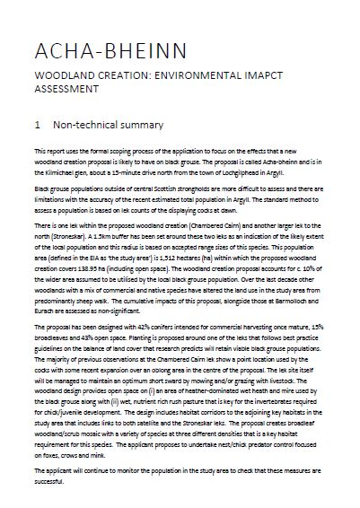 This report uses the formal scoping process of the application to focus on the effects that a new woodland creation proposal is likely to have on black grouse. The proposal is called Acha-bheinn and is in the Kilmichael glen, about a 15-minute drive north from the town of Lochgilphead in Argyll.