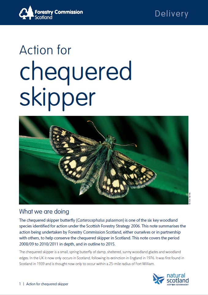 The chequered skipper is a small, spring butterfly of damp, sheltered, sunny woodland glades and woodland edges. In the UK it now only occurs in Scotland, following its extinction in England in 1976. It was first found in Scotland in 1939 and is thought now only to occur within a 25-mile radius of Fort William.