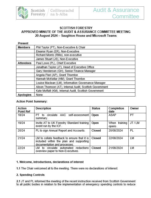 Audit and Assurance Committee minutes 20 August 2024, minutes, meeting, Audit and Assurance Committee, Audit & Assurance Committee (AAC), Non-Executive Members, Internal Audit, External Audit, Grant Thornton, Scottish Government