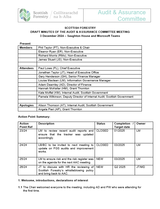 Forestry Grant Scheme (FGS) audit actions discussed; further updates to be provided by Grant Schemes Manager at next meeting.