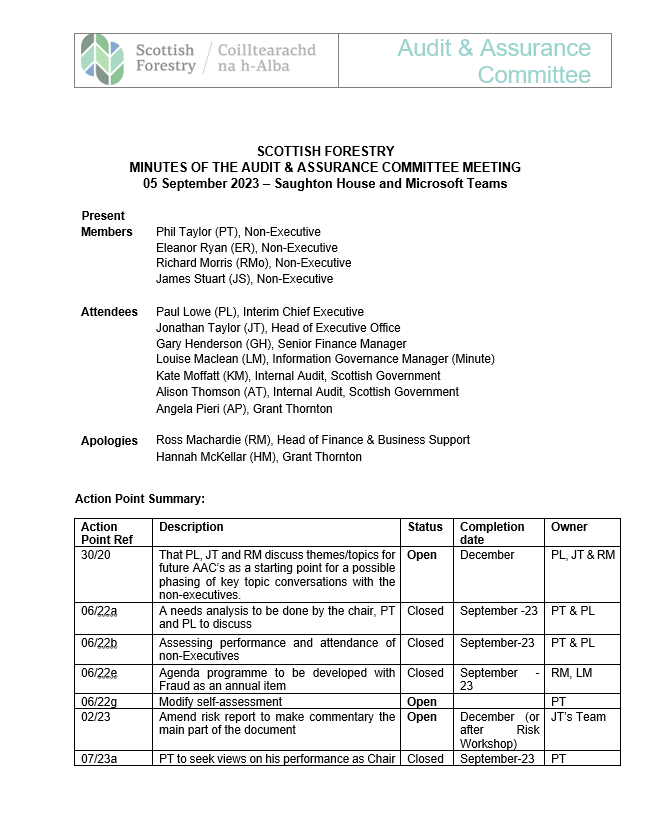 - Minutes (07/23) / Matters Arising / Audit Tracker (08/23)