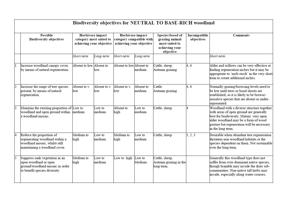 This table provides biodiversity objectives for neutral to base-rich woodland.