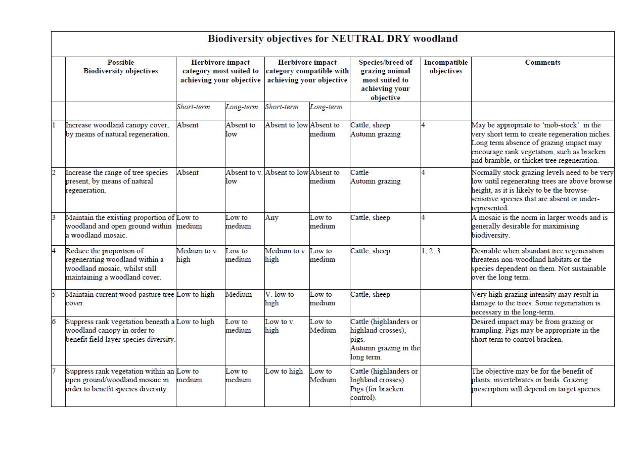 Possible biodiversity objectives, herbivore impact categories and incompatible objectives are listed along with further comments.