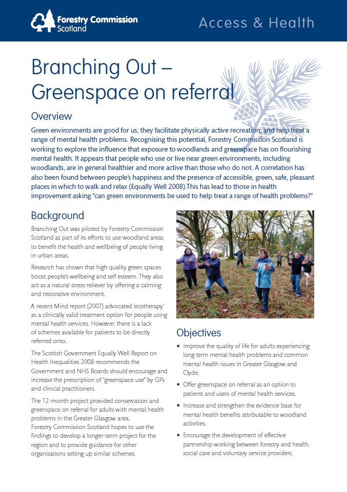 Green environments are good for us, they facilitate physically active recreation, and help treat a range of mental health problems. Recognising this potential, Forestry Commission Scotland (now Scottish Forestry) is working to explore the influence that exposure to woodlands and greenspace has on flourishing mental health. It appears that people who use or live near green environments, including woodlands, are in general healthier and more active than those who do not. A correlation has also been found between people’s happiness and the presence of accessible, green, safe, pleasant places in which to walk and relax (Equally Well 2008). This has lead to those in health improvement asking “can green environments be used to help treat a range of health problems?”