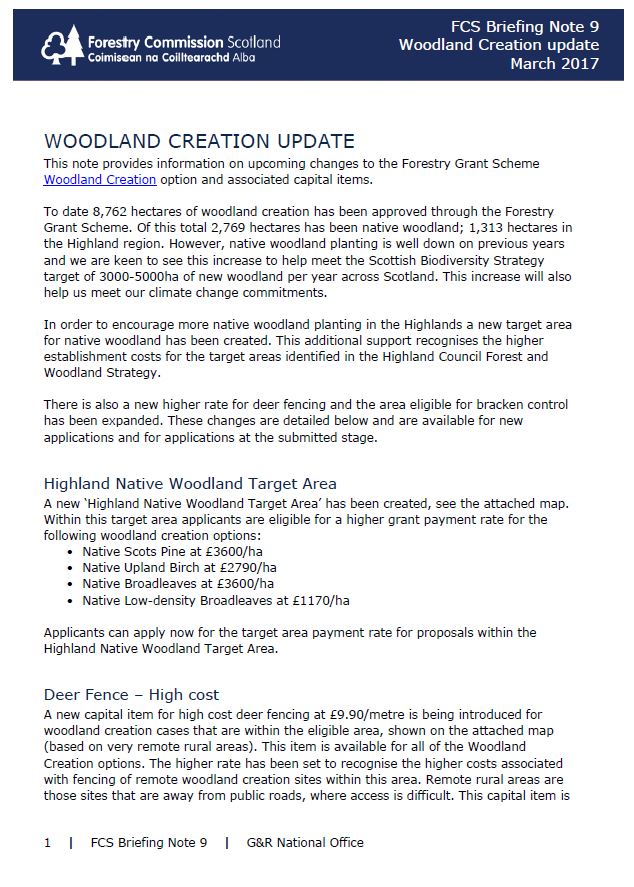 In order to encourage more native woodland planting in the Highlands a new target area for native woodland has been created. This additional support recognises the higher establishment costs for the target areas identified in the Highland Council Forest and Woodland Strategy. There is also a new higher rate for deer fencing and the area eligible for bracken control has been expanded. These changes are detailed within the document.