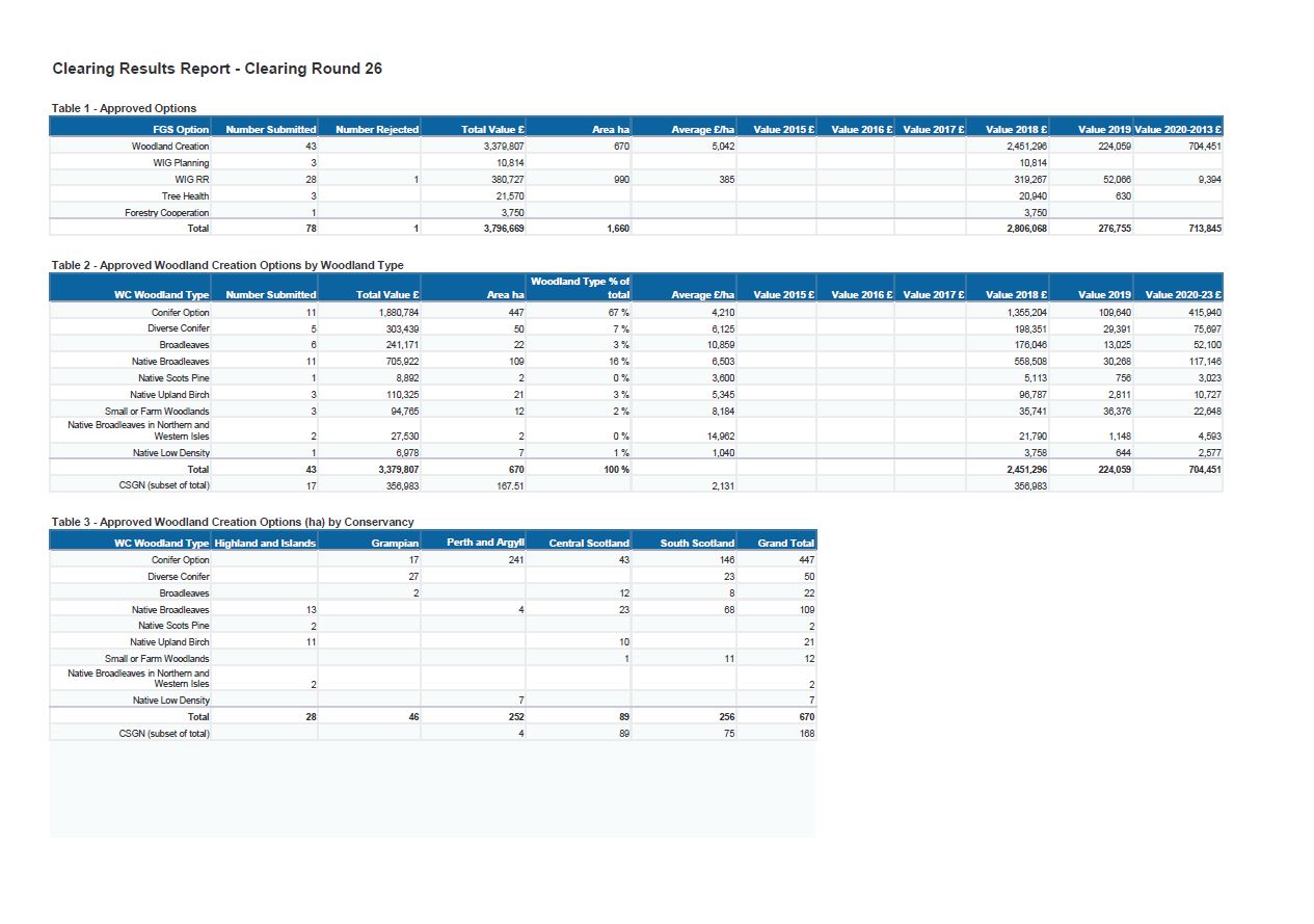 Approved options, approved woodland creation options by woodland type and approved woodland creation options by Conservancy are shown.