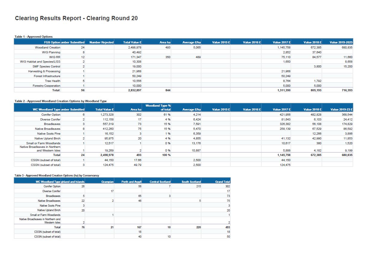 Approved options, approved woodland creation options by woodland type and approved woodland creation options by Conservancy are shown.