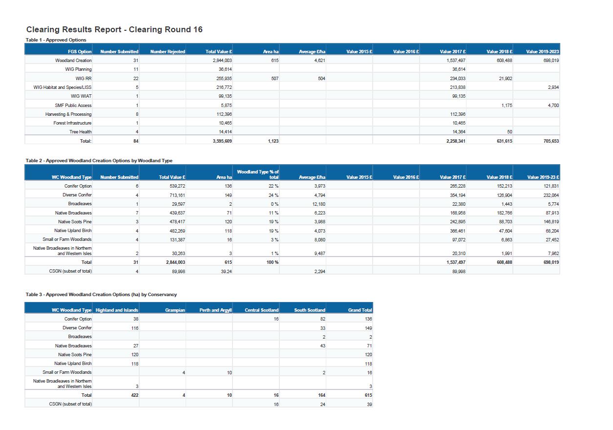 Approved options, approved woodland creation options by woodland type and approved woodland creation options by Conservancy are shown.