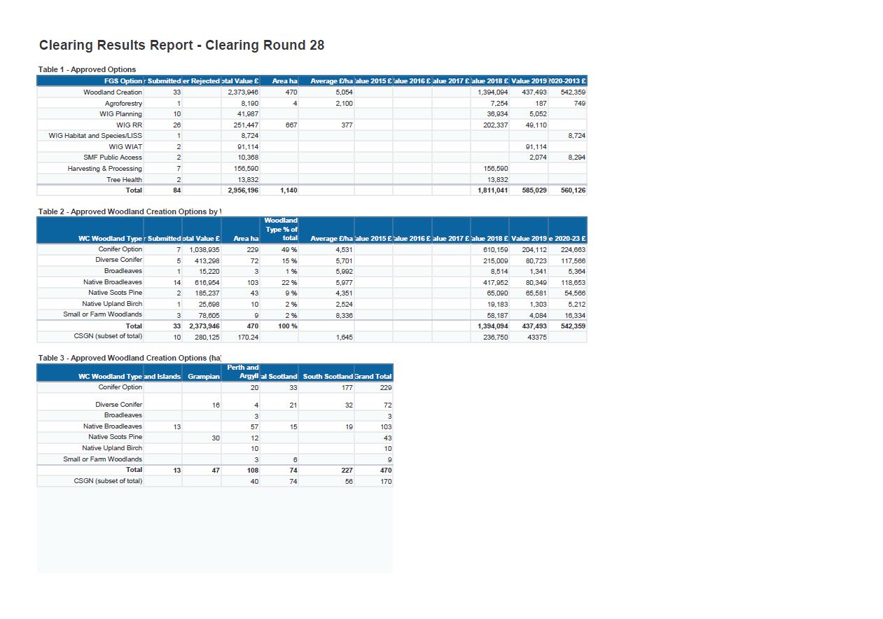 Approved options, approved woodland creation options by woodland type and approved woodland creation options by Conservancy are shown.