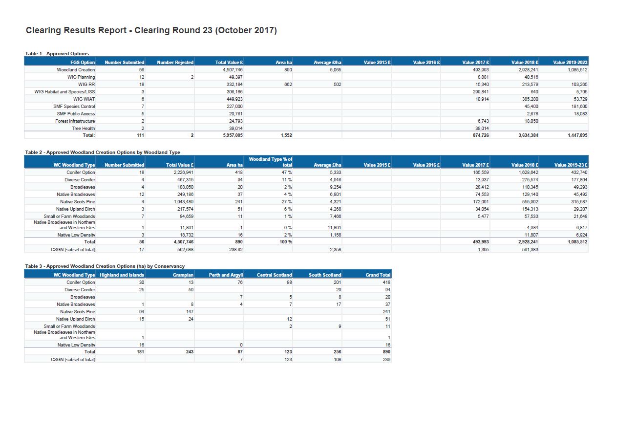 Approved options, approved woodland creation options by woodland type and approved woodland creation options by Conservancy are shown.