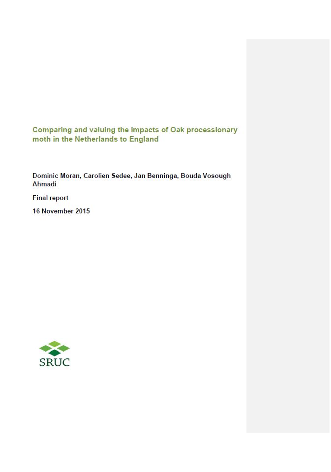 This study was carried out for the Forestry Commission by SRUC. It assesses data, literature, management approaches and governance frameworks on Oak Processionary Moth (OPM) in the Netherlands, where OPM is wide-spread, and considers potential implications for England. The study reviews available literature from both countries and considers potential implications for a wider outbreak in London. It examines impacts, primarily in terms of management costs and health care costs in the context of the Dutch risk-based approach to managing OPM.