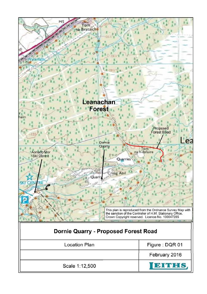 The project relates to the construction of an 856m long forestry road around the perimeter of Dornie quarry in Leanachan Forest near Torlundy. This will replace the existing 405m long North – South road which runs through the centre of quarry, between the existing quarry and the extension area. This North – South road will be removed as part of the quarry development. The new road covers an area of 0.31 hectares.