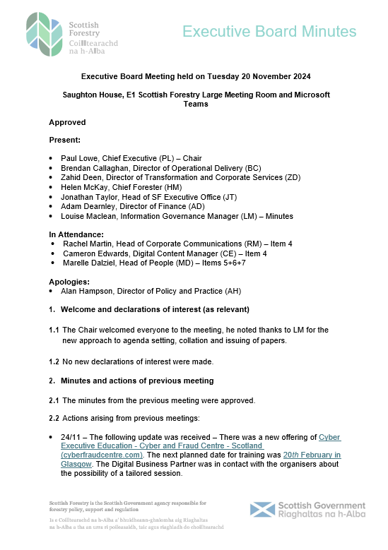 The Executive Board of Scottish Forestry discussed key strategic and operational updates, including progress on woodland creation targets pending the 2025/26 budget, a successful milestone in the website redevelopment project, and preparations for implementing a 35-hour working week based on staff feedback. The Board also reviewed the Equality, Diversity and Inclusion (EDI) Action Plan, agreed on realistic timelines for gender pay gap and youth engagement actions, and supported the development of a Women’s Network. Additional items included updates on internal policies and the scheduling of follow-up actions across several initiatives.