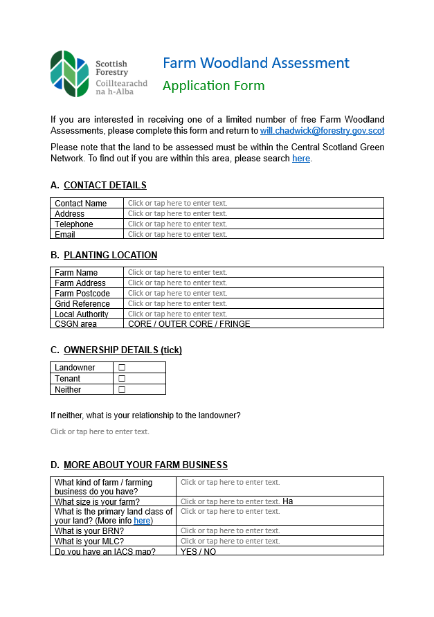 If you are interested in receiving one of a limited number of free Farm Woodland Assessments, please complete this form and return to will.chadwick@forestry.gov.scot.