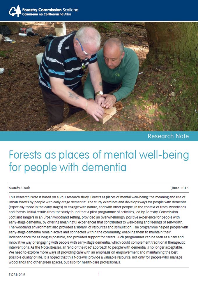 Initial results from the study found that a pilot programme of activities, led by Forestry Commission Scotland (now Scottish Forestry) rangers in an urban woodland setting, provided an overwhelmingly positive experience for people with early-stage dementia, by offering meaningful experiences that contributed to well-being and feelings of self-worth. The woodland environment also provided a ‘library’ of resources and stimulation. The programme helped people with early-stage dementia remain active and connected within the community, enabling them to maintain their independence for as long as possible, and provided support for carers. Such programmes can be seen as a new and innovative way of engaging with people with early-stage dementia, which could complement traditional therapeutic interventions. As the Note stresses, an ‘end of the road’ approach to people with dementia is no longer acceptable. We need to explore more ways of providing care with an emphasis on empowerment and maintaining the best possible quality of life. It is hoped that this Note will provide a valuable resource, not only for people who manage woodlands and other green spaces, but also for health-care professionals.
