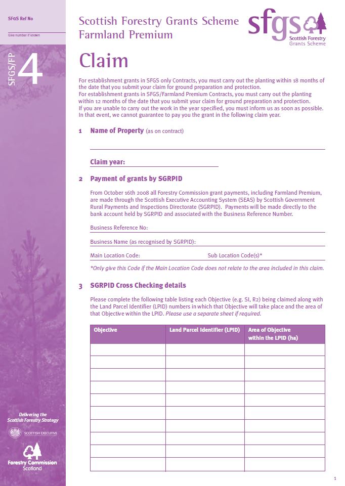 Scottish Forestry Grant Scheme Farmland Premium claim form.