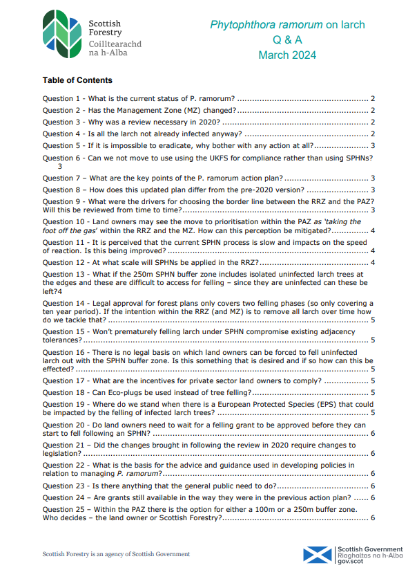 A Q&A document giving answers to some frequently asked questions about Scottish Government policy on Phytophthora ramorum management. Last updated in March 2024.