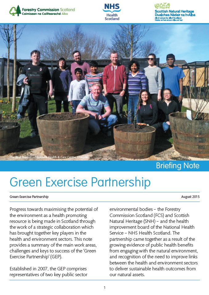 Established in 2007, the GEP comprises representatives of two key public sector environmental bodies – the Forestry Commission Scotland (FCS) and Scottish Natural Heritage (SNH) – and the health improvement board of the National Health Service – NHS Health Scotland. The partnership came together as a result of the growing evidence of public health benefits from engaging with the natural environment, and recognition of the need to improve links between the health and environment sectors to deliver sustainable health outcomes from our natural assets.