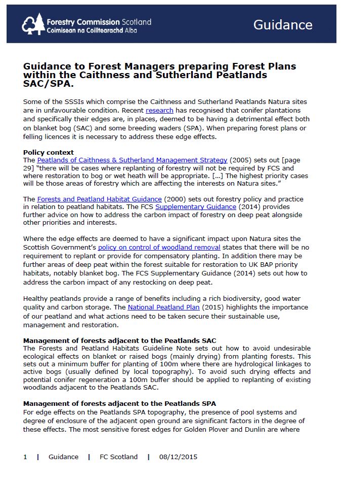 Some of the SSSIs which comprise the Caithness and Sutherland Peatlands Natura sites are in unfavourable condition. Recent research has recognised that conifer plantations and specifically their edges are, in places, deemed to be having a detrimental effect both on blanket bog (SAC) and some breeding waders (SPA). When preparing forest plans or felling licences it is necessary to address these edge effects.