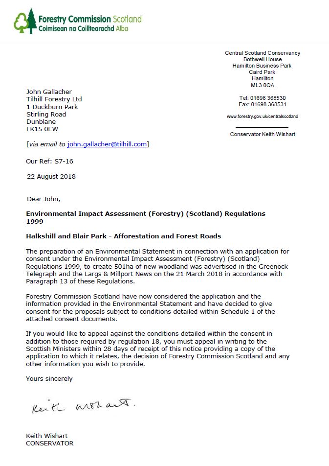 Halkshill and Blair Park Consent Decision Covering Letter