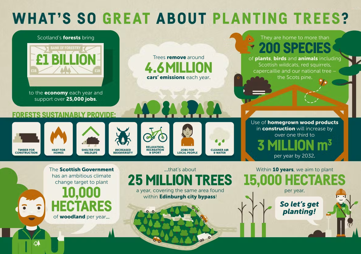 Infographic illustrating the benefits of planting trees, including economic, environmental, and biodiversity advantages.
