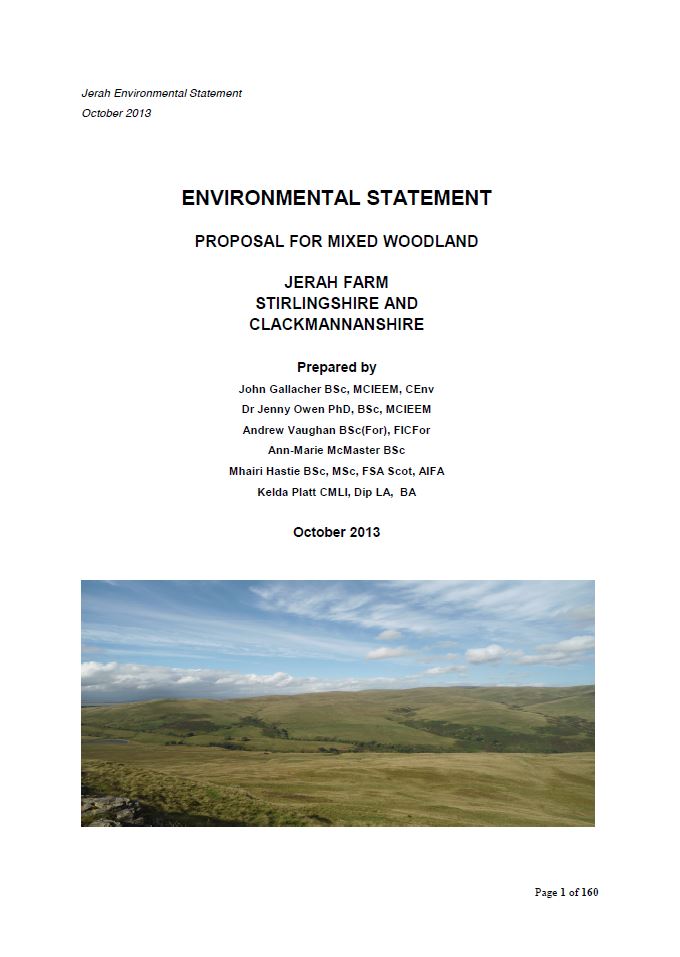 This Environmental Statement has been prepared to inform a proposal for the establishment of productive mixed woodland on Jerah Farm some 6km north west of Stirling.