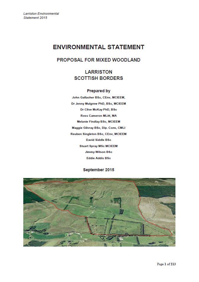 This Environmental Statement (ES) has been prepared to inform a proposal for the establishment of productive mixed woodland on the former hill farm of Larriston, near Newcastleton in the Scottish Borders.