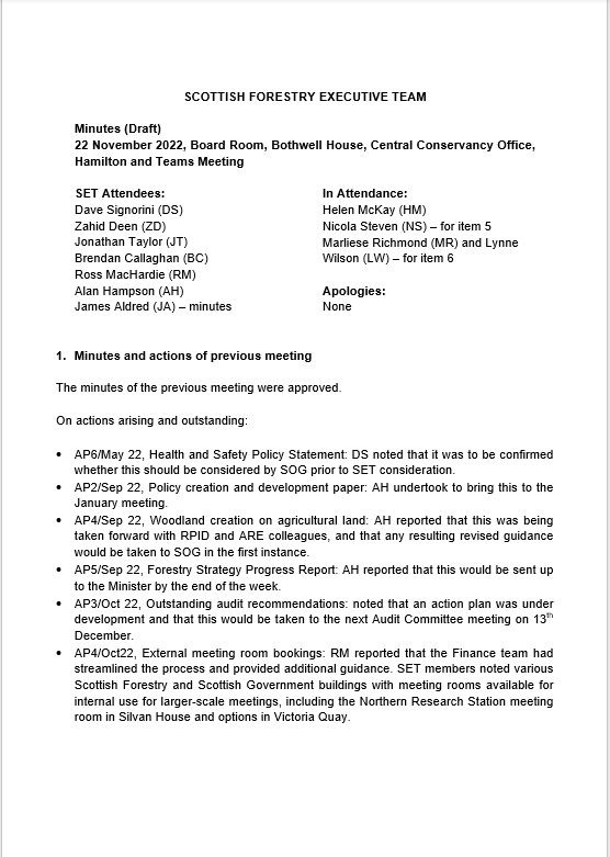 Scottish Forestry Executive Team (SFET) minutes for 22 November 2022.