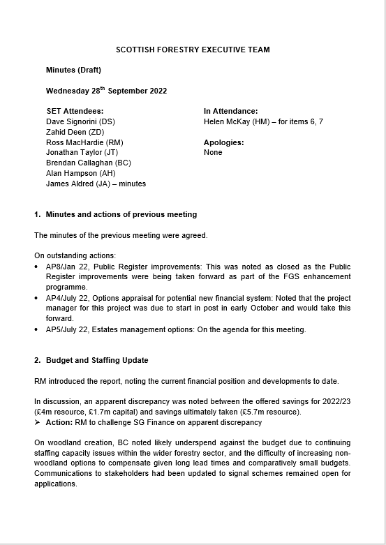 Scottish Forestry Executive Team (SFET) minutes for 28 September 2022.