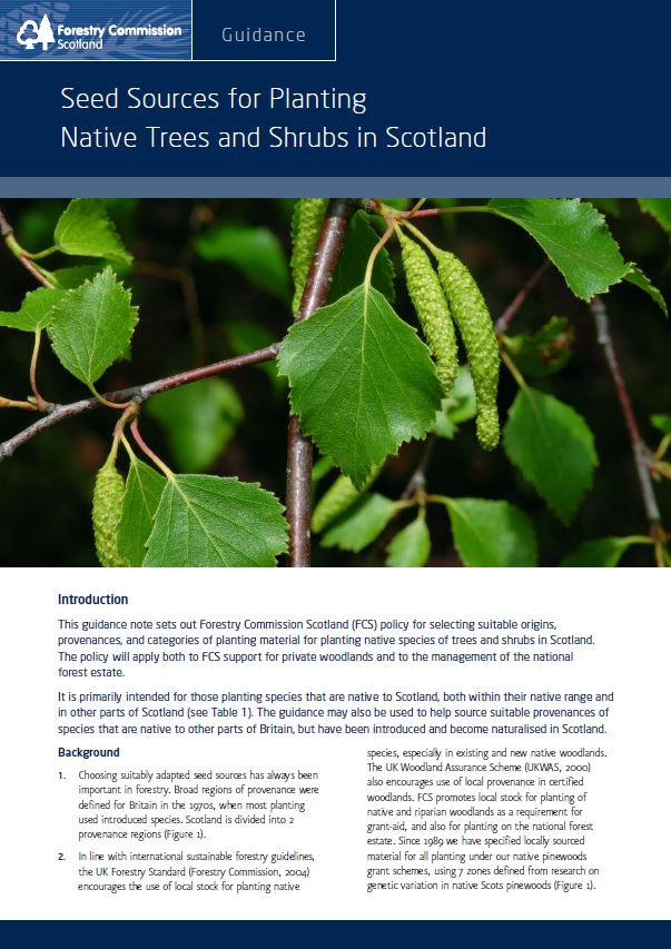 This guidance note sets out Forestry Commission Scotland (now Scottish Forestry) policy for selecting suitable origins, provenances, and categories of planting material for planting native species of trees and shrubs in Scotland.
