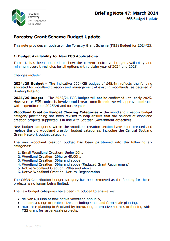 This briefing note (March 2024) provides an update on the Forestry Grant Scheme (FGS) Budget for 2024/25 and budget availability for new FGS applications.