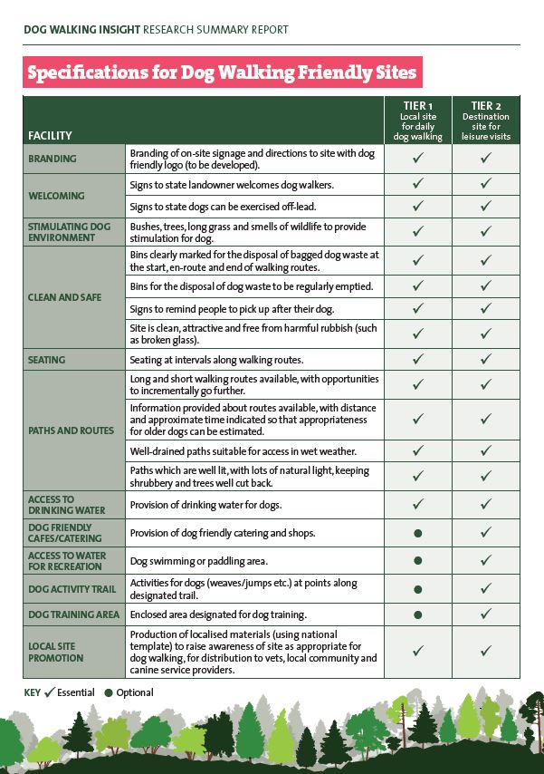 A list of essential and optional facilities for both local dog walking sites and destination sites for leisure visits.