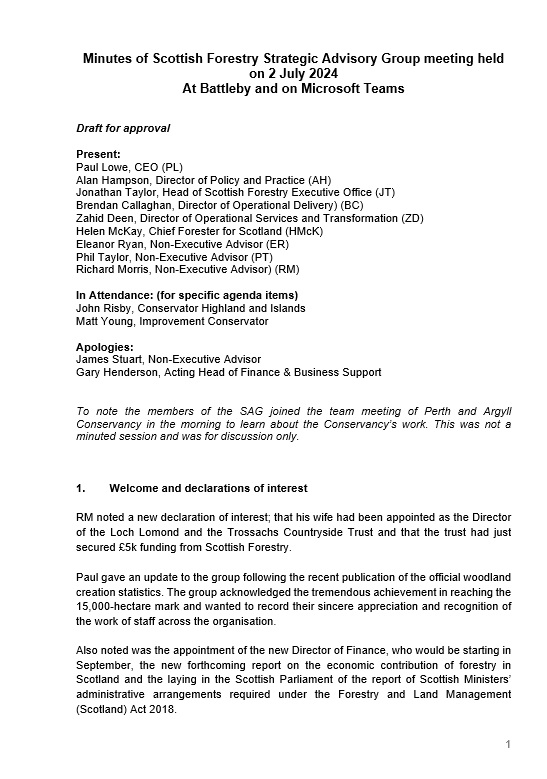 Meeting minutes for the Scottish Forestry Strategic Advisory Group from July 2024.