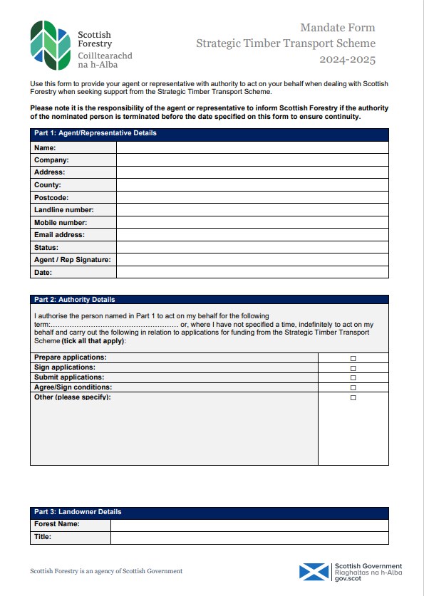 Strategic Timber Transport Scheme - Agents mandate form 2024-25 Last updated :28 Oct 2024 Topic: Using Woods and Forests Sub topic: Forest industry Summary Use this form to provide your agent or representative with authority to act on your behalf when dealing with Scottish Forestry when seeking support from the Strategic Timber Transport Scheme. Strategic Timber Transport Scheme - Agents mandate form 2024-25 PDF | (130.38 KB ) This file might not be suitable for users of assistive technology. Please contact us to request an alternative format. Share this page with others Copy link Email LinkedIn Facebook X formerly Twitter