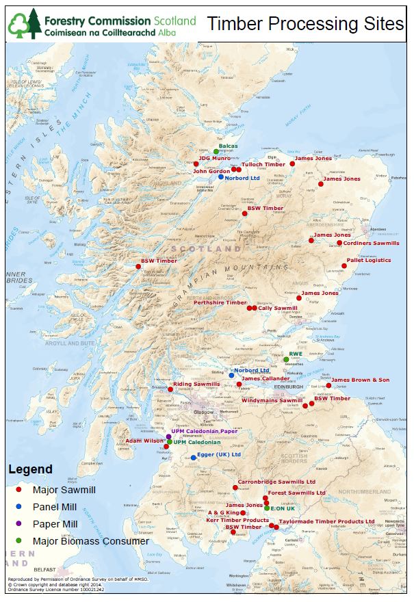 A map showing the location of timber processing sites in Scotland.
