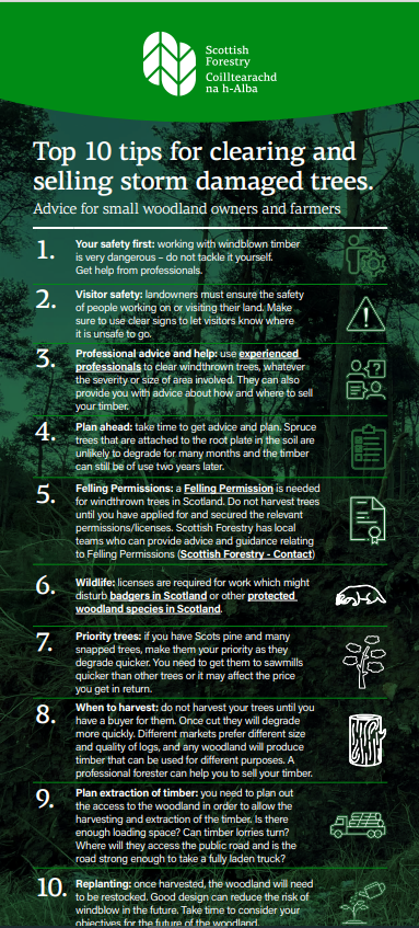 Top 10 tips for storms Last updated :28 Oct 2024 Topic: Managing Woods and Forests Sub topic: Forest operations Top 10 tips for storms PDF | (540.89 KB ) This file might not be suitable for users of assistive technology. Please contact us to request an alternative format. Share this page with others Copy link Email LinkedIn Facebook X formerly Twitter