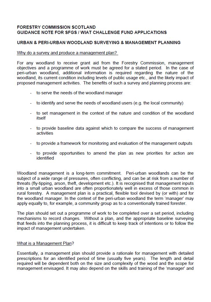 For any woodland to receive grant aid from Scottish Forestry, management objectives and a programme of work must be agreed for a stated period. In the case of peri-urban woodland, additional information is required regarding the nature of the woodland, its current condition including levels of public usage etc., and the likely impact of proposed management activities.