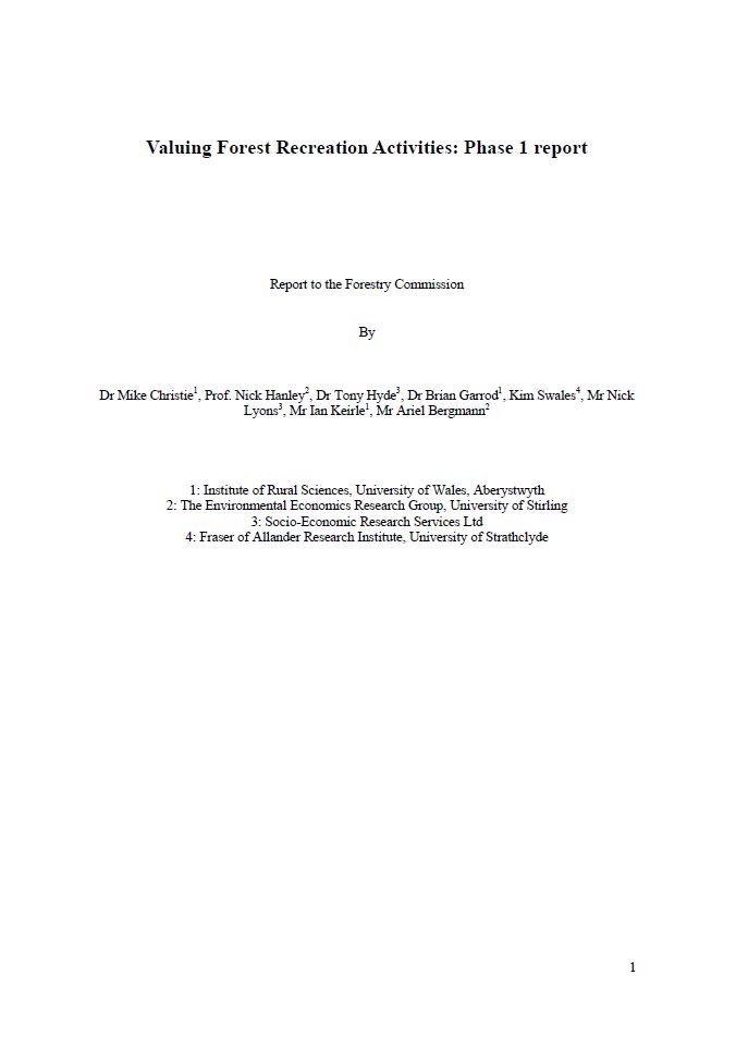 This research aims to estimate the effect on consumer surplus of changes in the provision of key forest recreation facilities, to examine the heterogeneity of recreational values across different forest users and uses and to estimate the economic impact of forest recreation activities.