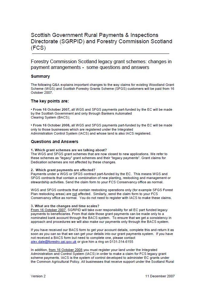 The following Q&A explains important changes to the way claims for existing Woodland Grant Scheme (WGS) and Scottish Forestry Grants Scheme (SFGS) customers will be paid from 16 October 2007.